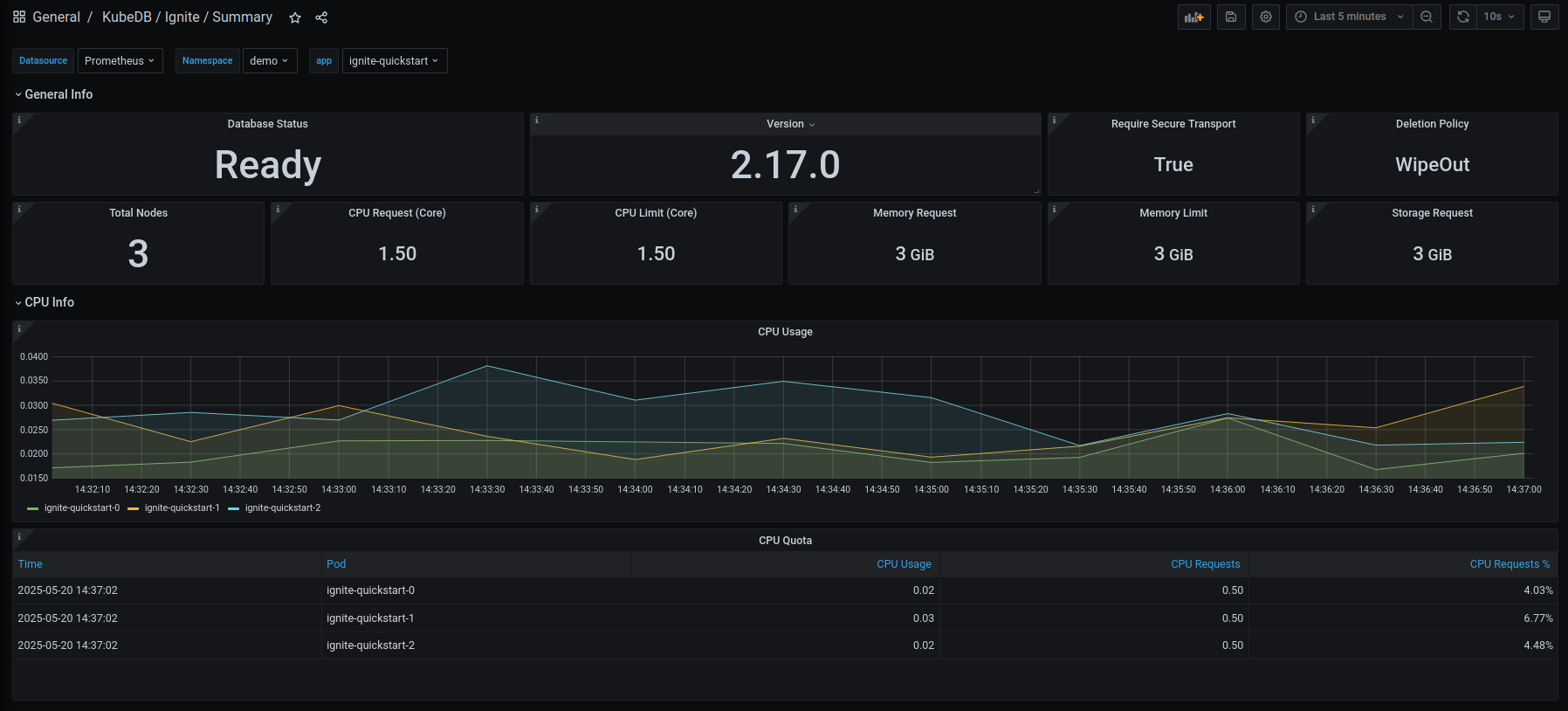 This release introduces an enhanced monitoring feature for KubeDB-managed Ignite deployments by integrating Grafana dashboards. These dashboards provide comprehensive insights into various Ignite-specific metrics, statuses, as well as visual representations of memory and CPU consumption. With this dashboard, users can effortlessly assess the overall health and performance of Ignite, enabling more informed decision-making and efficient resource management. Have a look here for a step-by-step guide to use the monitoring feature in Ignite.